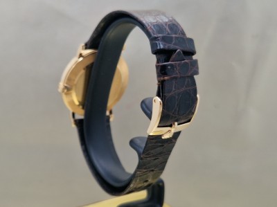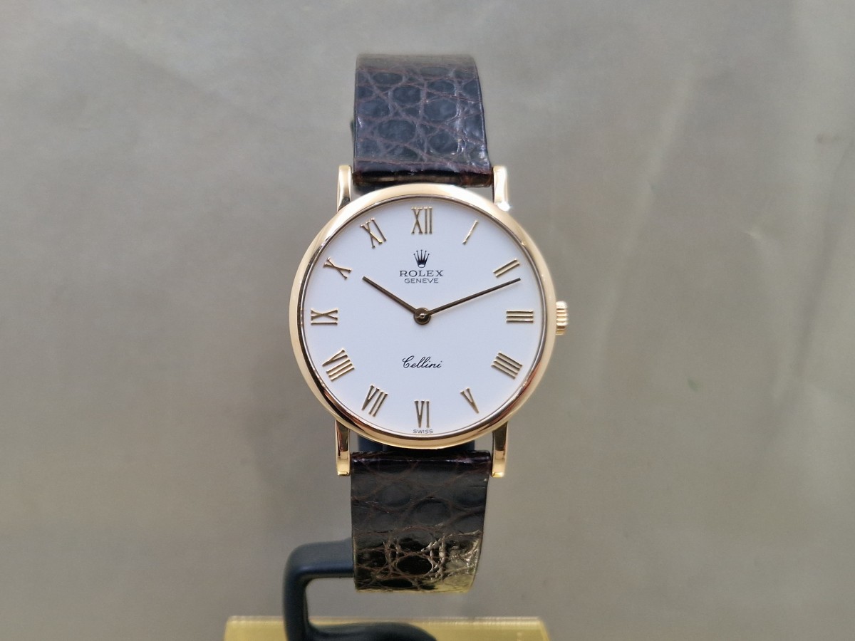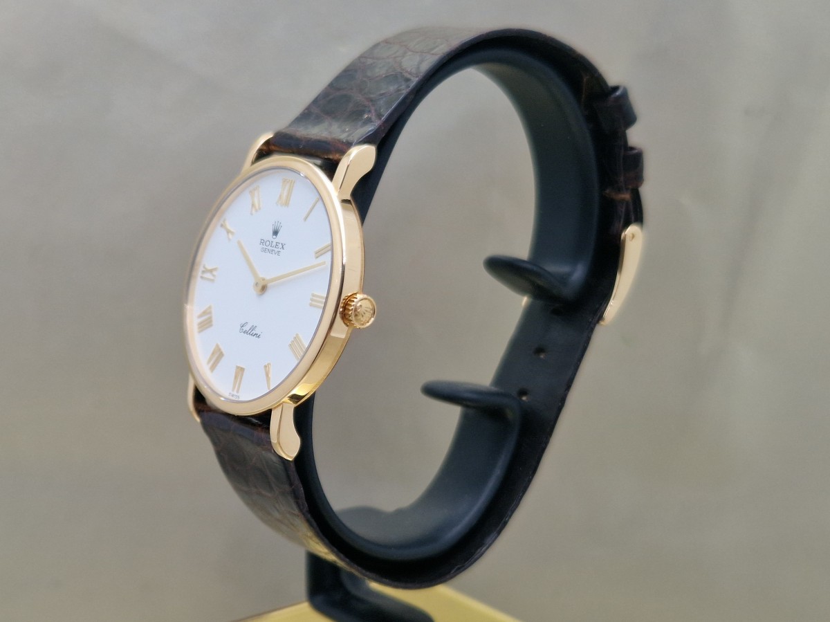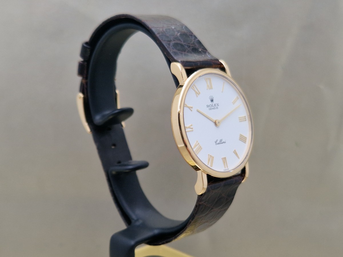 Un elegante Rolex Cellini in oro giallo 18kt con un classico quadrante bianco e numeri romani, perfetto per ogni occasione. Questo orologio da uomo presenta un movimento manuale e si presenta in condizioni pari al nuovo, completo di scatola e documenti originali. Un pezzo di rara bellezza che unisce la tradizione orologiera alla raffinatezza senza tempo.